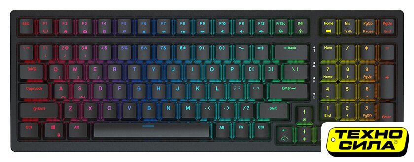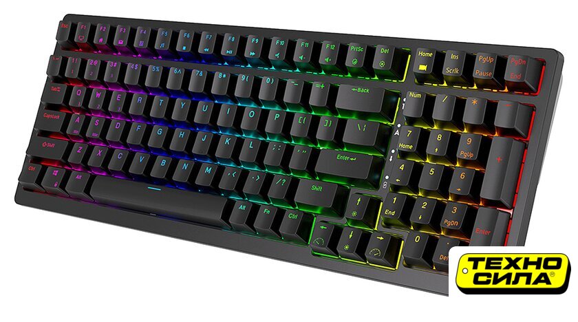 игровая для ПК, механическая, Redragon Purple, ход тактильный, пластик, интерфейс подключения - USB-A/радио/Bluetooth, кириллица: да, цвет прозрачный/синий