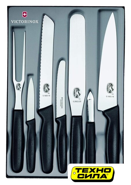 Комплектация | Вилка поварская для разделки, 15 см Нож для чистки овощей,заостренный конец, 8 см Нож для хлеба, серрейтор, 18 см Нож для томатов, серрейтор, 11 см Лопатка кондитерская, гибкая, 20 см Картофелечистка односторонняяНож разделочный, 19 см |