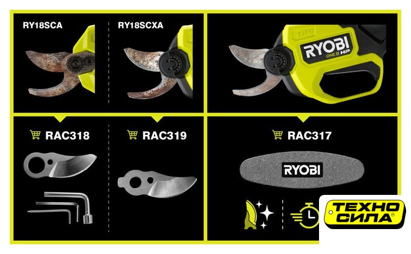 Комплектация | Cменное лезвие для секатора RYOBI RY18SCA - 1 шт.Ключ для замены лезвия - 3 шт.Упаковка |