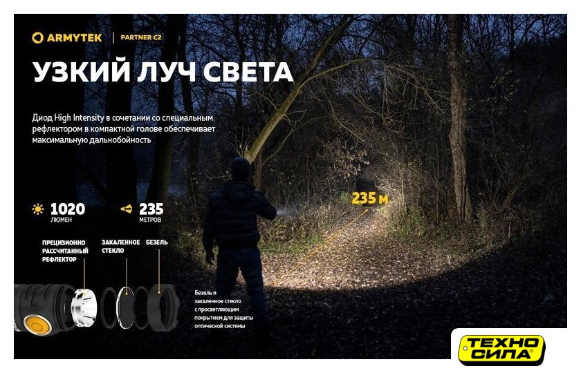 налобный, светодиод, 1100 лм в максимальном режиме, 98 м, максимальное время работы: 13 ч, 1x18650