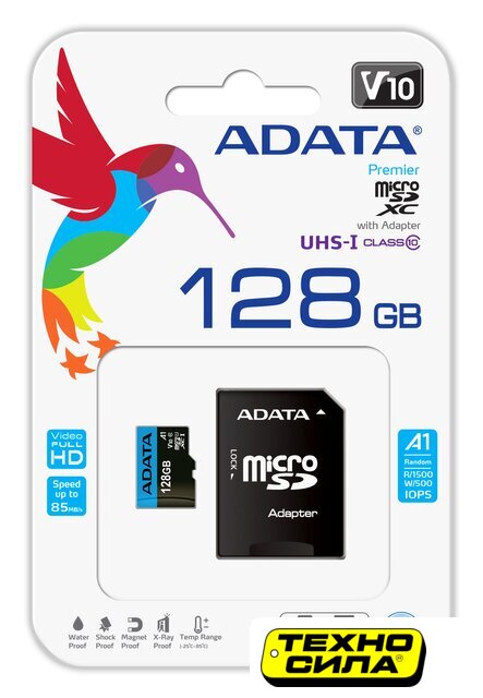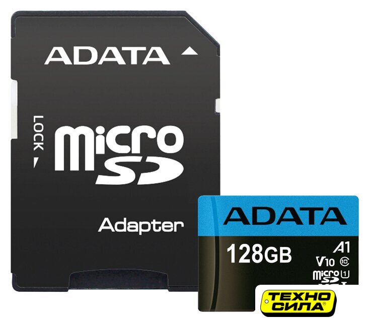 128 ГБ, класс 10, UHS-I (класс U1), чтение: 100 МБ/с, запись: 10 МБ/с, адаптер