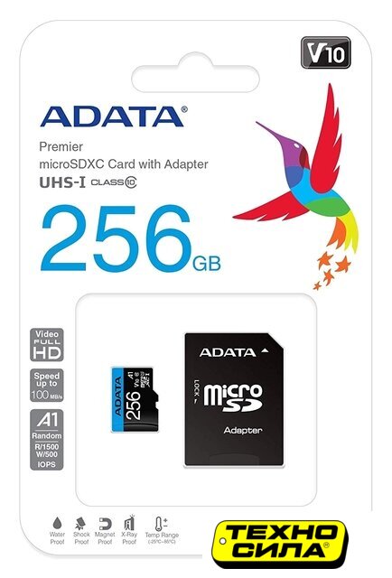 256 Гб, класс 10, UHS-I (класс U1), чтение: 100 МБ/с, запись: 10 МБ/с, адаптер