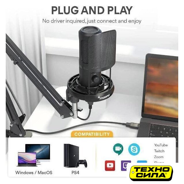 электретный (малый конденсатор), настольный, для стриминга и подкастов, кардиоидная/круговая/двойная ("восьмерка")/стерео направленность, 40-20000 Гц, разъем подключения USB Type-A, длина кабеля 1.5 м