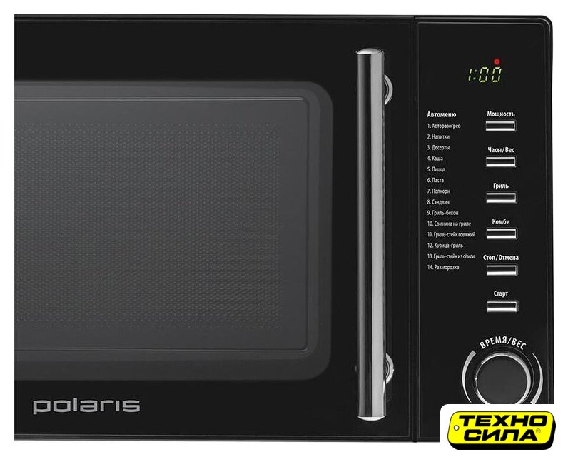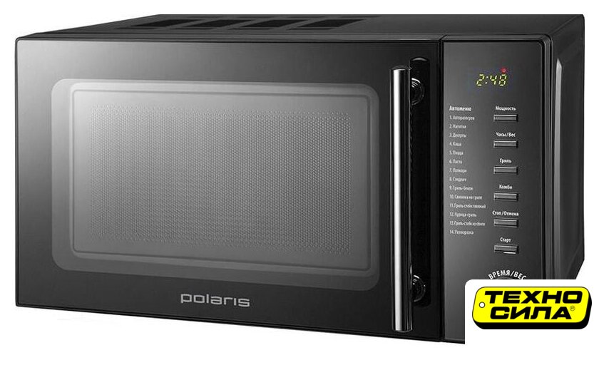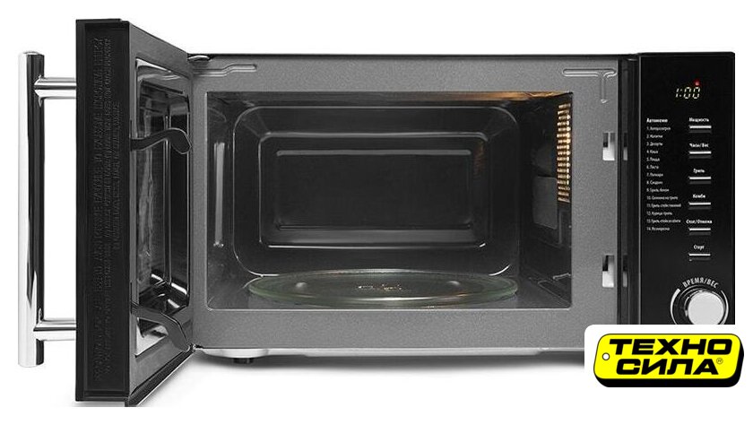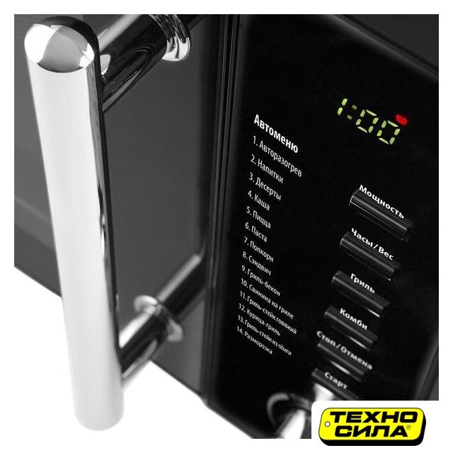 отдельностоящая, микроволны (соло), объем 23 л, выходная мощность микроволн 800 Вт, управление электронное, автоприготовление, авторазмораживание, цвет нержавеющая сталь/черный