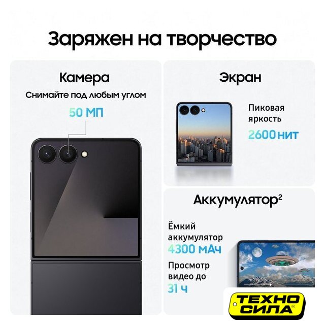 | Отличия от предыдущего поколения | ✅ Galaxy Z Flip7 получил увеличенный внешний экран FlexWindow размером 4,1 дюйма с частотой обновления 120 Гц и яркостью до 2600 нит, что позволяет использовать множество функций без необходимости раскрывать устройство. Основной внутренний дисплей также увеличился до 6,9 дюйма, обеспечивая более комфортное взаимодействие с контентом. Кроме того, устройство стало тоньше и легче, что улучшает его портативность и удобство использования.✅ В отличие от Z Flip6, который оснащался процессором Snapdragon 8 Gen 3, новый Z Flip7 работает на базе 10-ядерного чипсета Exynos 2500, выполненного по 3-нм техпроцессу, что обеспечивает улучшенную производительность и энергоэффективность.✅ Внешний экран Galaxy Z Flip7 имеет более тонкие рамки, самые тонким в серии Galaxy Z Flip. Такая конструкция от края до края создает ощущение безграничного экрана, что делает его еще более удобным для использования в сложенном состоянии. В раскрытом виде это наш самый тонкий Flip, что ставит его в один ряд с любым другим смартфоном. Размер основного экрана увеличился до 6,9 дюйма, а соотношение сторон составляет 21:9, что обеспечивает более разнообразное использование. |