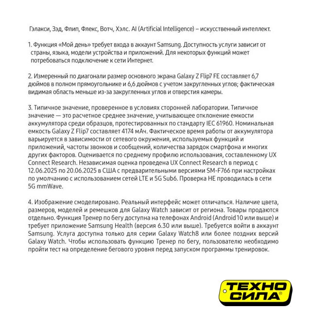 | Отличия от предыдущего поколения | ✅ Galaxy Z Flip7 получил увеличенный внешний экран FlexWindow размером 4,1 дюйма с частотой обновления 120 Гц и яркостью до 2600 нит, что позволяет использовать множество функций без необходимости раскрывать устройство. Основной внутренний дисплей также увеличился до 6,9 дюйма, обеспечивая более комфортное взаимодействие с контентом. Кроме того, устройство стало тоньше и легче, что улучшает его портативность и удобство использования.✅ В отличие от Z Flip6, который оснащался процессором Snapdragon 8 Gen 3, новый Z Flip7 работает на базе 10-ядерного чипсета Exynos 2500, выполненного по 3-нм техпроцессу, что обеспечивает улучшенную производительность и энергоэффективность.✅ Внешний экран Galaxy Z Flip7 имеет более тонкие рамки, самые тонким в серии Galaxy Z Flip. Такая конструкция от края до края создает ощущение безграничного экрана, что делает его еще более удобным для использования в сложенном состоянии. В раскрытом виде это наш самый тонкий Flip, что ставит его в один ряд с любым другим смартфоном. Размер основного экрана увеличился до 6,9 дюйма, а соотношение сторон составляет 21:9, что обеспечивает более разнообразное использование. |
