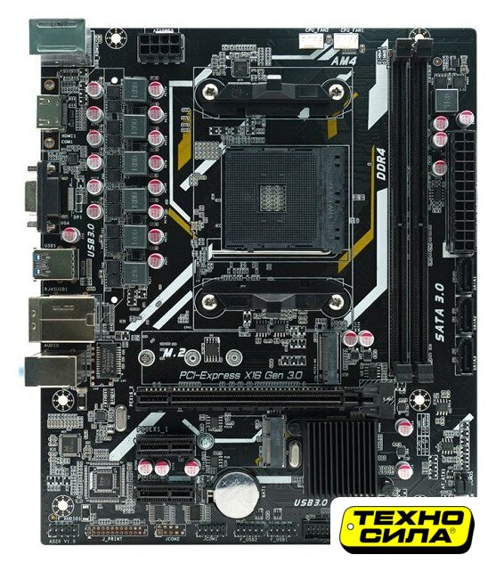 mATX, сокет AMD AM4, чипсет AMD A520, память 2xDDR4 до 4933 МГц, слоты: 1xPCIe x16 3.0, 2xPCIe x1, 1xM.2