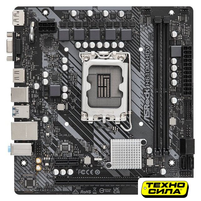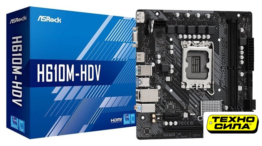 mATX, сокет Intel LGA1700, чипсет Intel H610, память 2xDDR4 до 3200 МГц, слоты: 1xPCIe x16 4.0, 1xPCIe x1, 1xM.2