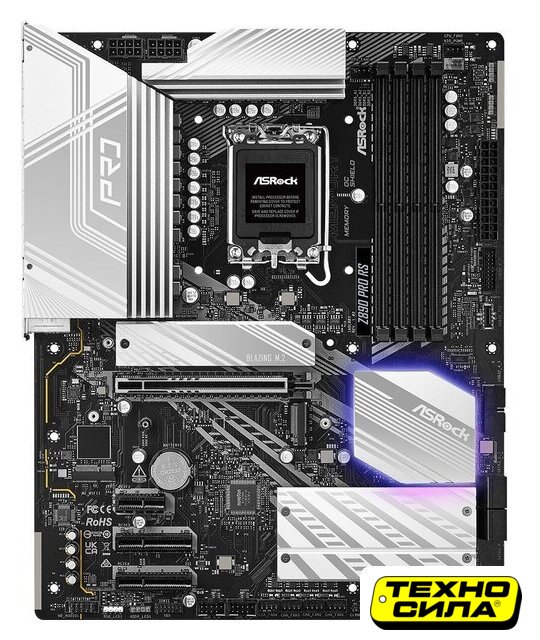 mATX, сокет Intel LGA1851, чипсет Intel B860, память 4xDDR5 до 9066 МГц, слоты: 4xPCIe x16 5.0, 2xM.2, 802.11ax (Wi-Fi 6E)+Bluetooth 5.3, 5+1+2 фаз питания