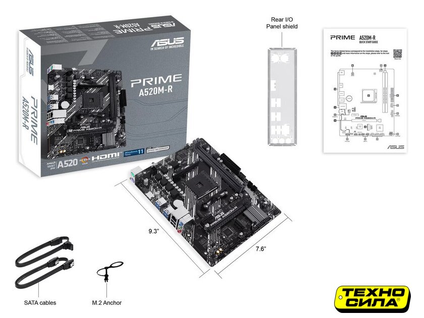 mATX, сокет AMD AM4, чипсет AMD A520, память 4xDDR4 до 4733 МГц, слоты: 1xPCIe x16, 1xPCIe x1, 1xM.2