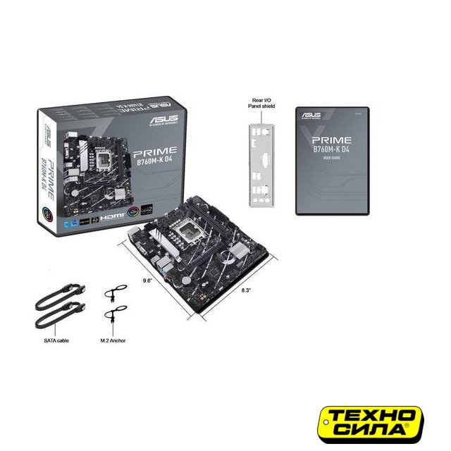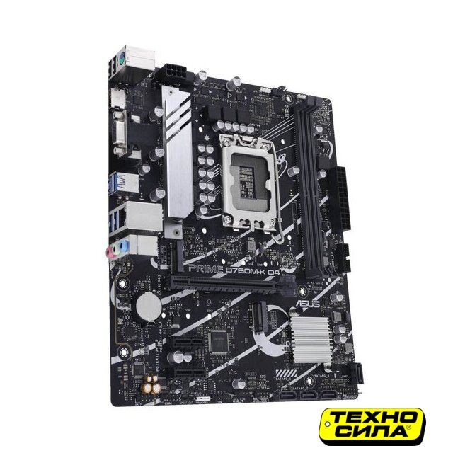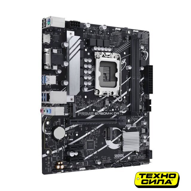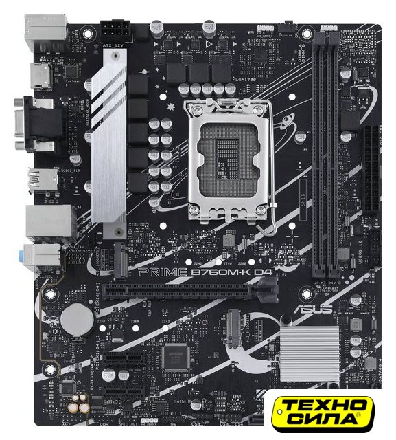 mATX, сокет Intel LGA1700, чипсет Intel B760, память 2xDDR4 до 3200 МГц, слоты: 1xPCIe x16 4.0, 1xPCIe x1, 2xM.2, 6+1+1 фаз питания