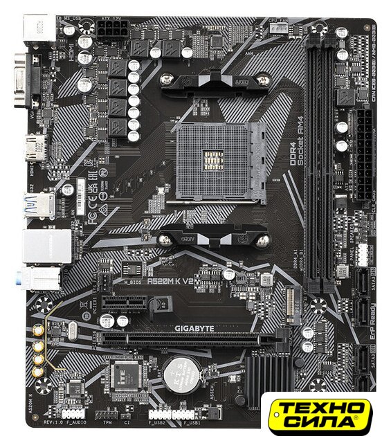 mATX, сокет AMD AM4, чипсет AMD A520, память 2xDDR4, слоты: 1xPCIe x16, 2xPCIe x1, 1xM.2