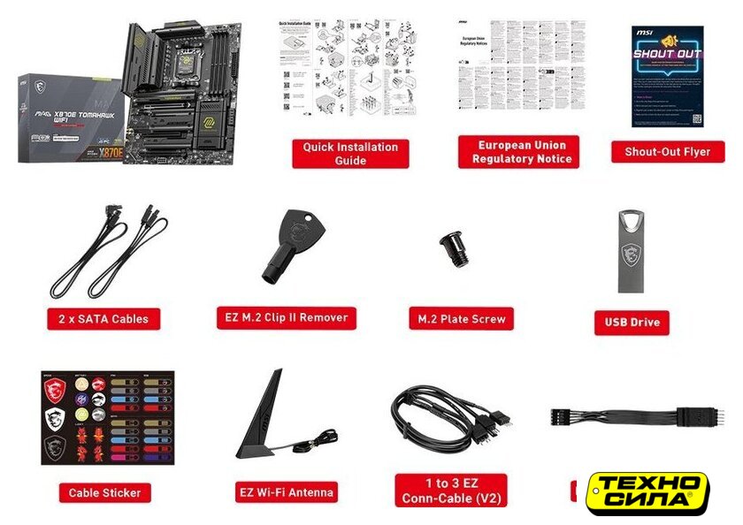| Комплектация | - 2 кабеля SATA- EZ Wi-Fi антенна - EZ кабель передней панели- 1-3 EZ кабель - винт для M.2 - EZ M.2 Clip II экстрактор- набор стикеров- USB Flash накопитель - документация |