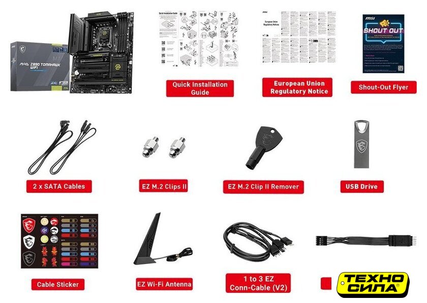 Комплектация | - EZ Wi-Fi антенна - USB Flash накопитель - стикеры для кабелей- 2 кабеля SATA- EZ кабель фронтальной панели- 1EZ - 3EZ кабель - ключ-экстрактор EZ M.2 Clip II - 2 винта со стойкой EZ M.2 Clip II- документация |