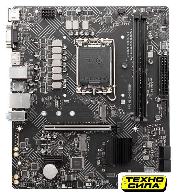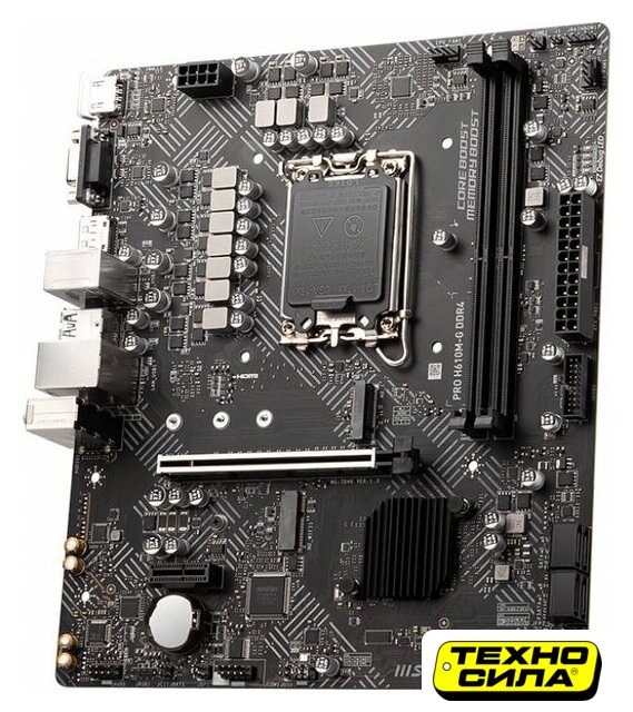 mATX, сокет Intel LGA1700, чипсет Intel H610, память 2xDDR4 до 3200 МГц, слоты: 1xPCIe x16 4.0, 1xPCIe x1