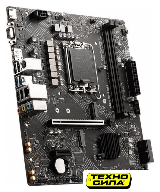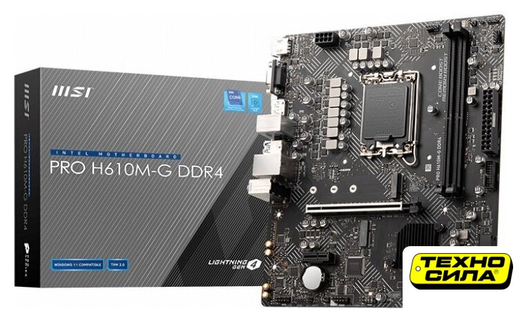 mATX, сокет Intel LGA1700, чипсет Intel H610, память 2xDDR4 до 3200 МГц, слоты: 1xPCIe x16 4.0, 1xPCIe x1, 1xM.2, 4+1+1 фаз питания