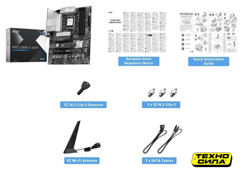 Комплектация | - EZ Wi-Fi антенна - 2 кабеля SATA- ключ-экстрактор EZ M.2 Clip II - 3 винта со стойкой EZ M.2 Clip II- документация |