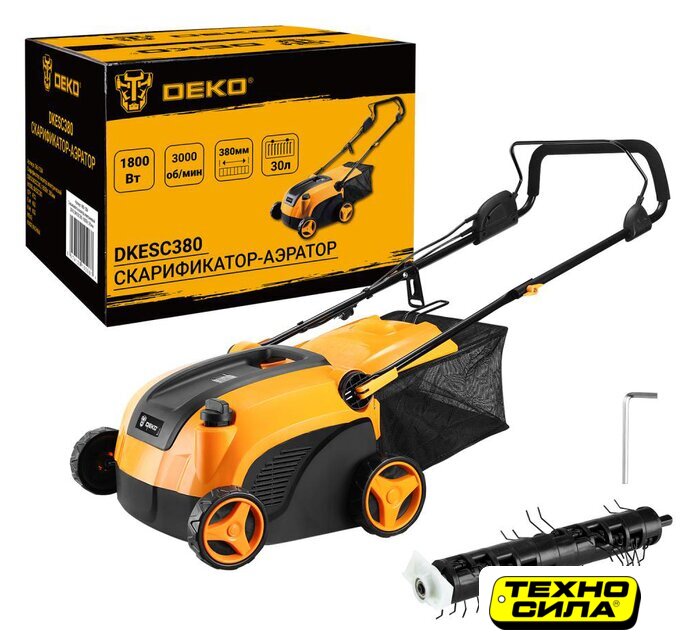 скарификатор-аэратор, электрический двигатель 1500 Вт, ширина скашивания: 32 см, мягкий травосборник 40 л, корпус: пластик