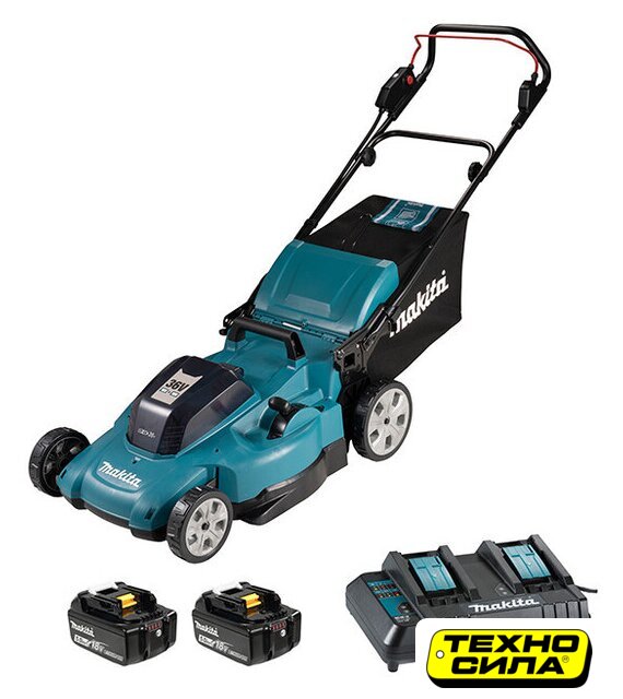 Комплектация | - 2 аккумулятора 18V 5,0 Ah;- зарядное устройство DC18SH;- нож, - травосборник, - заглушка для мульчирования |