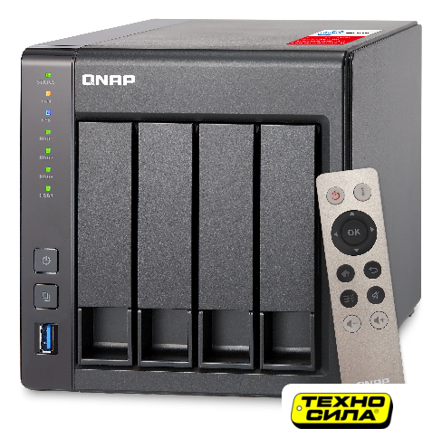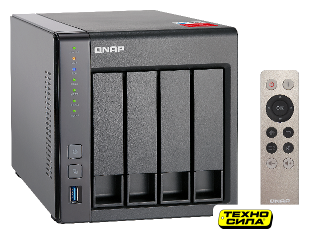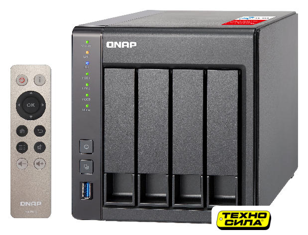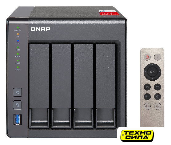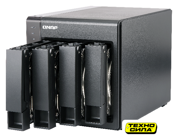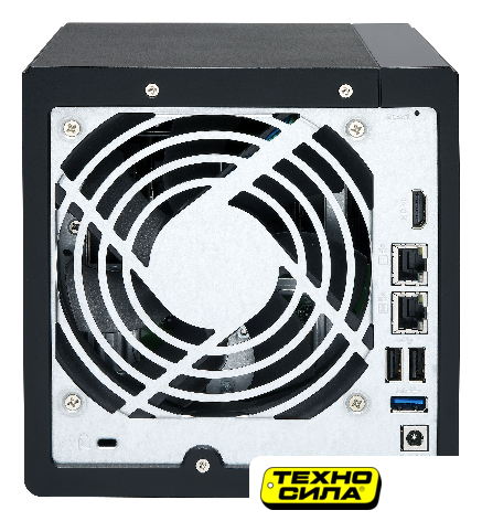 4 x 3.5"/2.5", RAID 1/5/5 + spare/6/6 + spare/10 + spare/JBOD, hot swap, охлаждение активное, LAN 2x2.5 Гбит/с + 2x10 Гбит/с, 4xUSB 3.0