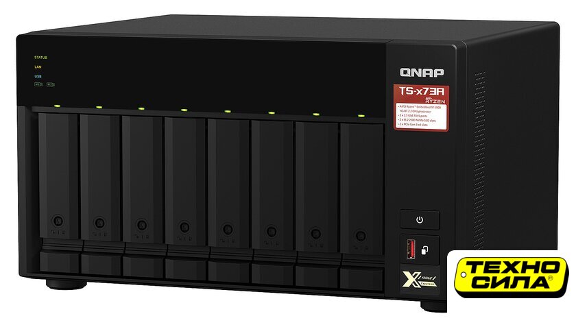8 x 3.5"/2.5" SATA 3.0, RAID 1/5/6/10/JBOD, hot swap, охлаждение воздушное, LAN 2x2.5 Гбит/с + 2x10 Гбит/с, 4x USB-A 3.2 Gen1