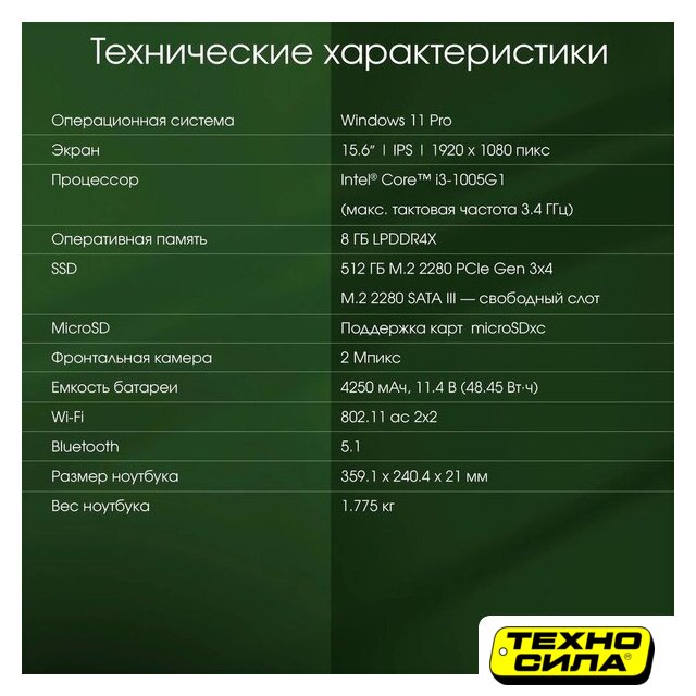 15.6" 1920 x 1080, IPS, 60 Гц, Intel Core i3 10110U, 8 ГБ DDR4, SSD 256 ГБ, видеокарта встроенная, Windows 11 Pro, цвет крышки серый, аккумулятор 49 Вт·ч