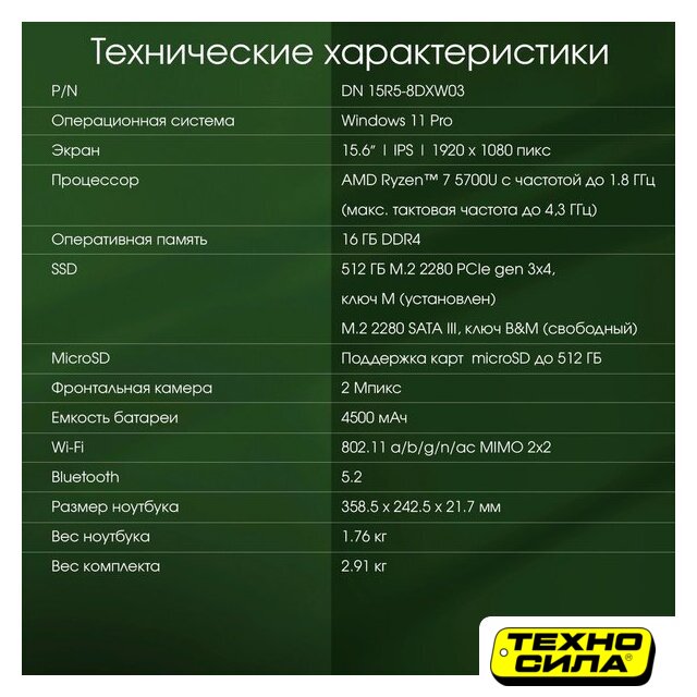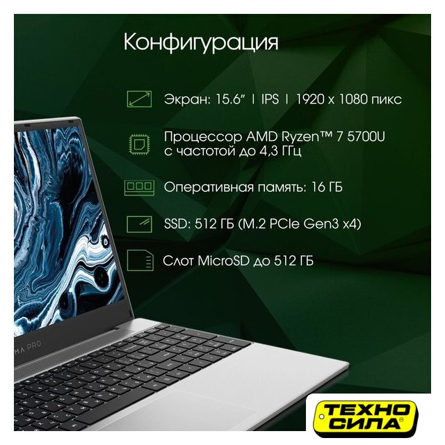 1920 x 1080 IPS, AMD Ryzen 7 5700U, 16 ГБ, SSD 512 ГБ, встроенная, Windows 11 Pro, цвет крышки серебристый