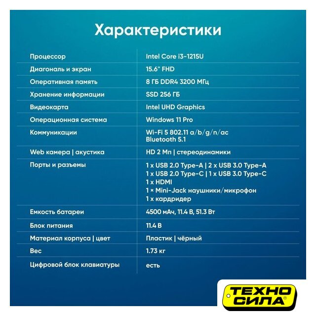 15.6" 1920 x 1080, IPS, 60 Гц, Intel Core i3 1215U, 8 ГБ DDR4, SSD 256 ГБ, видеокарта встроенная, Windows 11 Pro, цвет крышки серый, аккумулятор 48.5 Вт·ч