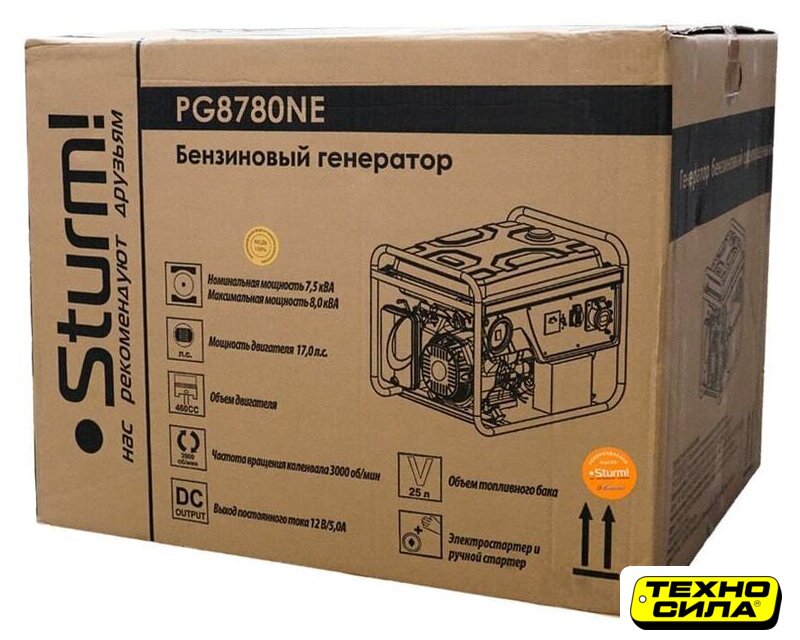 бензиновый, исполнение: открытое, 7.5 кВт, запуск: ручной/электростартер, время непрерывной работы: 8 ч, 102 кг