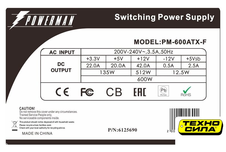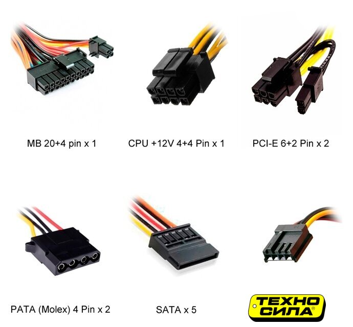 ATX 500 Вт, вентилятор 1x80 мм, 1x 12В 38А