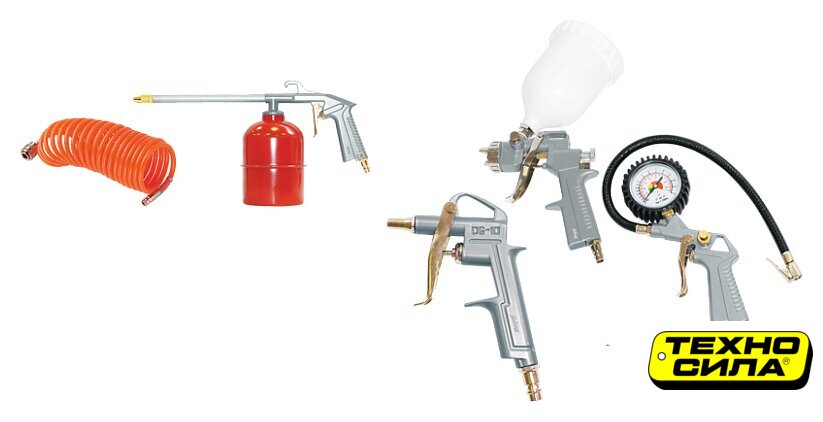 Комплектация | краскораспылитель с верхним бачком объемом 0,6 лпневмопистолет для вязких жидкостей с бачком 0,85 лпневмопистолет для продувкипневмопистолет для накачки шин с манометормспиральный шланг 5м |