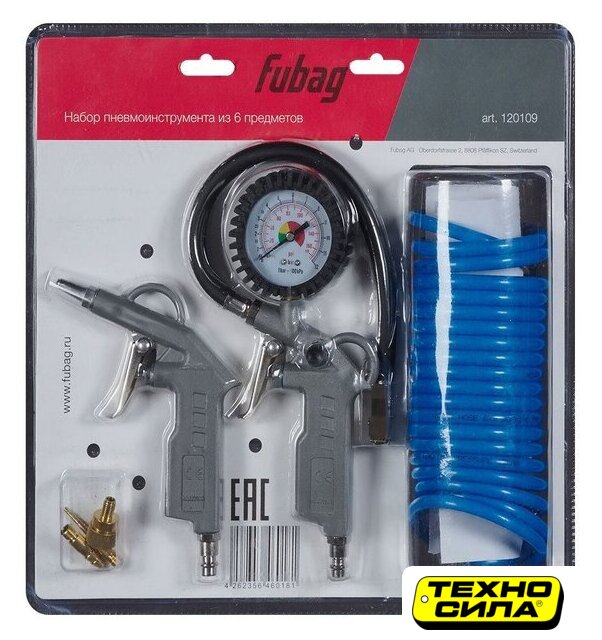 Комплектация | - Пистолет для накачки с манометром - 1 шт.- Продувочный пистолет - 1 шт.- Спиральный шланг 5 м - 1 шт.- Насадки для накачки - 3 шт.- Блистер |
