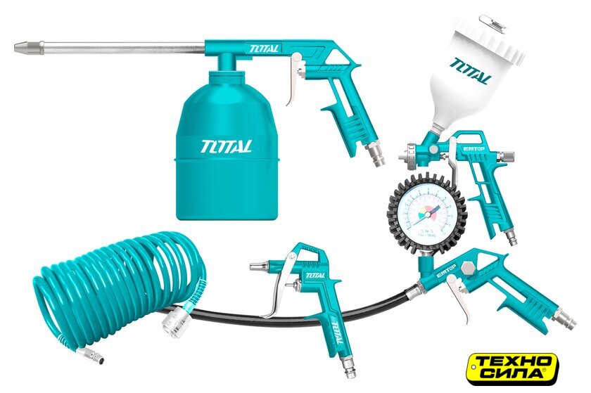 Комплектация | Краскораспылитель с верхним бачкомПродувочный пистолетМоющий пистолетПистолет для подкачкиШланг воздушный спиральный |