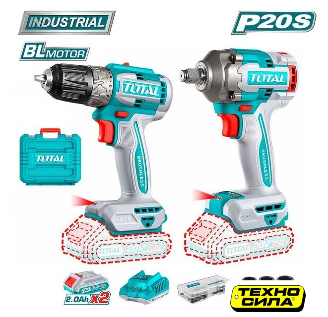 Комплектация | - Дрель-шуруповерт TDLI204531 - 1 шт.- Гайковерт TOTAL TIWLI2040 - 1 шт.- Аккумулятор TFBLI20011 2 А*ч - 2 шт.- Зарядное устройство TFCLI2001 - 1 шт.- Торцевые головки (17, 19, 21 мм) - 3 шт.- Аксессуары 47 - шт.- Инструкция- Кейс |