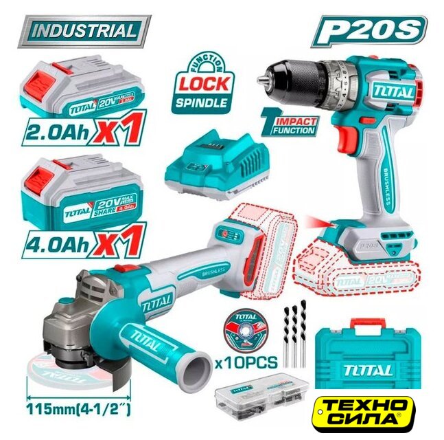 Комплектация | Дрель-шуруповерт TOTAL TIDLI206681 - 1 шт. Угловая шлифмашина TOTAL TAGLI21154 - 1 шт. Аккумулятор 2,0 А*ч - 1 шт. Аккумулятор 4,0 А*ч - 1 шт. Быстрое зарядное устройство - 1 шт. Боковая рукоятка - 1 шт. Защитный кожух - 1 шт. Фланцевый ключ - 1 шт. Отрезной диск - 10 шт. Набор набор аксессуаров 47 шт. Инструкция Кейс |