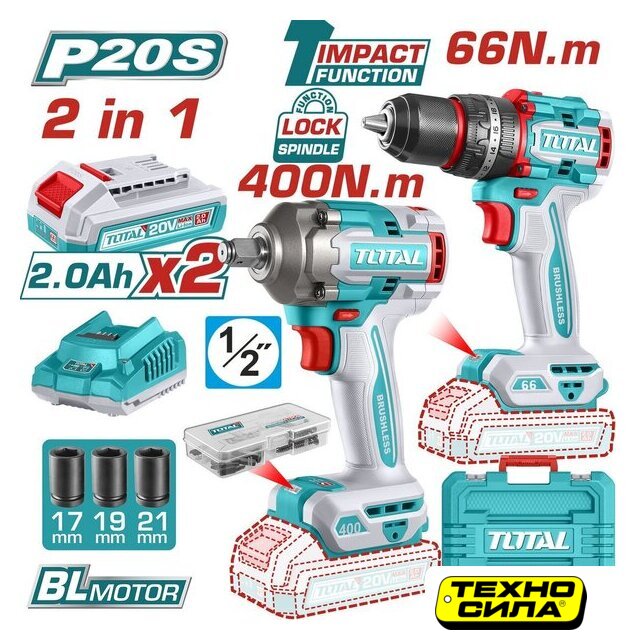 Комплектация | Дрель-шуруповерт ударная TOTAL TIDLI206681 - 1 шт.Гайковерт TOTAL TIWLI20401 - 1 шт.Аккумулятор 2,0 Ач TFBLI20011 - 2 шт.Зарядное устройство TFCLI2001 - 1 шт.Аксессуары для дрели шуруповерта - 47 шт.Торцевые головки (17, 19, 21 мм) - 3 шт.ИнструкцияКейс |