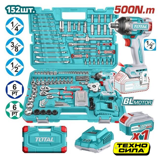 Комплектация | Гайковерт TOTAL TIWLI2050 - 1 шт.Аккумулятор 4,0 А·ч TFBLI2002 - 1 шт.Зарядное устройство TFCLI2001E - 1 шт.Трещотка 1/4" - 1 шт.Торцевые головки 1/4" (4 / 4,5 / 5 / 5,5 / 6 / 7 / 8 / 9 / 10 / 11 / 12 / 13 / 14) - 13 шт.Головки 1/4"x32(L) с битами: Н3 / H4 / H5 / H6 / H8 / T8 / T10 / T15 / T20 / T25 / T30 / T40 / SL5,5 / SL6,5 / PH2 / PH3 / PZ2 / PZ3 - 18 шт.Глубокие головки 1/4" DR 50 мм(L): 8, 9, 10, 12 мм - 4 шт.Удлинитель 1/4" DR x 50 мм - 1 шт.Вороток: 1/4" x 150 мм - 1 шт.Карданный шарнир 1/4" - 1 шт.Трёхходовой адаптер 1/4"(F) x 1/4"(M) - 1 шт.Держатель бит: 1/4"x6,35 мм - 1 шт.Биты 6,35x25мм (L): T5 / T6 / T7 / T8 / T9 / T10 / T15 / T20 / T25 / T30 / PH1 / PH2 / PH2 / PH3 / PH4 / PZ1 / PZ2 / PZ2 / PZ3 / PZ4 / SL3 / SL3 / SL4 / SL4 / SL5 / SL5.5 / SL6 / SL6.5 / SL7 / SL7 / H2 / H3 / H3 / H4 / H4 / H5 / H5 / H6 / H7 / H7 - 40 шт.Ударные головки 17, 19, 21, 22 мм - 4 шт.Трещотка 1/2" - 1 шт.Карданный шарнир 1/2" - 1 шт.Головки 1/2" (21, 22, 23, 24, 27, 30, 32 мм) - 7 шт.Свечные головки 1/2" (16, 21 мм) - 2 шт.Удлинители: 1/2" (125 мм, 250 мм) - 2 шт.Трёхсторонний адаптер 1/2": 3/8"(M) x 1/2"(F) - 1 шт.Шестигранные головки 3/8" (10, 11, 12, 13, 14, 15, 16, 17, 18, 19 мм) - 10 шт.Глубокие шестигранные головки 3/8" (13, 14, 15, 17 мм) - 4 шт.Звездообразные головки 3/8" (E10, E11, E12, E14, E16, E18, E20) - 7 шт.Вороток 3/8" - 1 шт.Удлинители 3/8" (75 мм, 150 мм) - 2 шт.Карданный шарнир 3/8" - 1 шт.Трёхсторонний адаптер 3/8": 3/8"(F)x3/8"(M) - 1 шт.Ключ для масляного фильтра - 1 шт.Отвёртки: SL6.5x150, PH2x150 - 2 шт.комбинированные ключи 6, 8, 9, 10, 11, 12, 13, 14, 15, 17, 18, 19 - 12 шт.Ключи Torx T10, T15, T20, T25, T27, T30, T40, T45, T50 - 9 шт.Кейс |