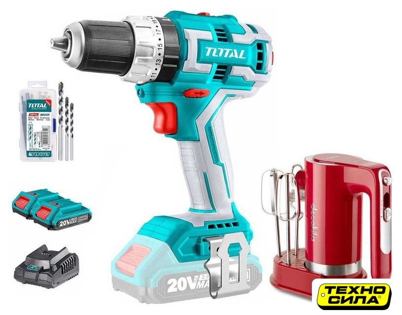 Комплектация | - Дрель-шуруповерт ударная TOTAL TIDLI20608 - 1 шт.- Аккумулятор 2,0 А*ч - 2 шт.- Быстрое зарядное устройство - 1 шт.- Набор оснастки и крепежа - 50 шт.- Миксер Decakila KMMX006R - 1 шт.- Венчики - 2 шт.- Капучинатор (вспениватель молока) - 1 шт.- Инструкция |