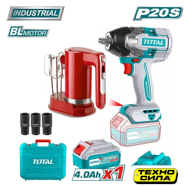 Комплектация | - Гайковерт TOTAL TIWLI20851 - 1 шт.- Аккумулятор TFBLI2002 4,0 Ач - 1 шт.- Зарядное устройство TFCLI2001E - 1 шт.- Торцевая головка (22, 24, 27 мм) - 3 шт.- Миксер TMK006H - 1 шт.- Венчики - 2 шт.- Вспениватель молока - 1 шт.- Кейс |