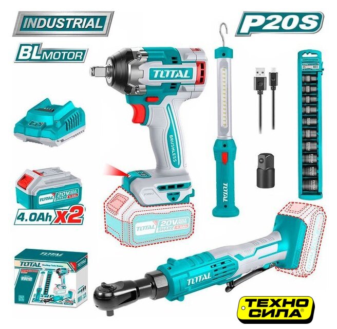 Комплектация | - Гайковерт TIWLI2050 - 1 шт.- Трещотка TOTAL TDRLI2060151 - 1 шт.- Фонарь TOTAL TWLI35261 - 1 шт.- Аккумулятор TFBLI2002 4,0 Ач - 2 шт.- Зарядное устройство TFCLI2001 - 1 шт.- Переходник 3/8" квадрат / 1/2" квадрат - 1 шт.- Ударные торцевые головки - 10 шт.- Кабель USB для зарядки TWLI35261 - 1 шт.- Коробка |