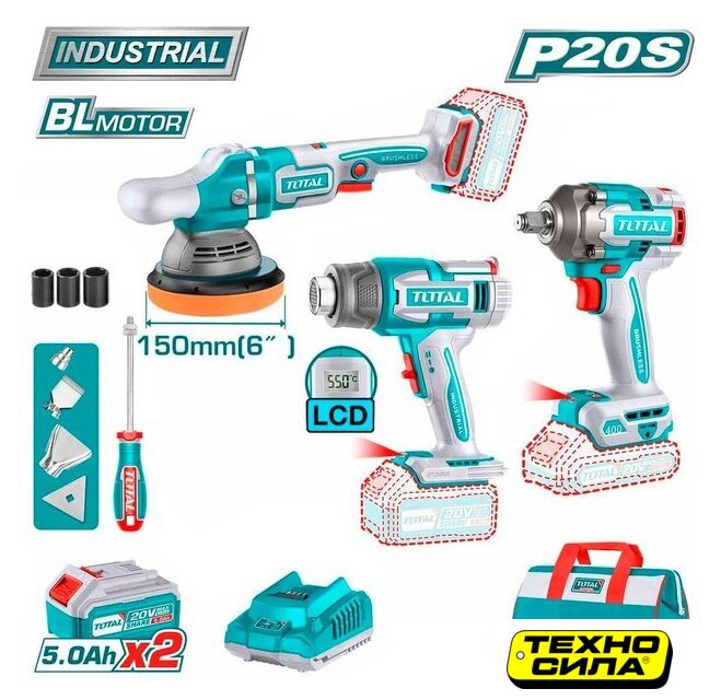 Комплектация | - Гайковерт TIWLI20401 - 1 шт.- Полировальная машина TOTAL TAPLI20151 - 1 шт.- Фен строительный TOTAL TBLI2003 - 1 шт.- Аккумулятор TFBLI20531 5,0 Ач - 2 шт.- Зарядное устройство TFCLI2001 - 1 шт.- Насадка для фена - 3 шт.- Торцевые головки (17, 19, 21 мм) - 3 шт.- Полировальная насадка - 1 шт.- Сумка.- Коробка. |