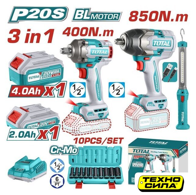 Комплектация | Гайковерт TOTAL TIWLI20851 - 1 шт.Гайковерт TOTAL TIWLI20401 - 1 шт.Фонарь TOTAL TWLI35261 - 1 шт.Аккумулятор 4,0 Ач TFBLI20021 - 1 шт.Аккумулятор 2,0 Ач TFBLI20011 - 1 шт.Зарядное устройство TFCLI2001 - 1 шт.Набор ударных головок 1/2" Cr-Mo (10, 12, 13, 14, 15, 17, 19, 21, 22, 24 мм) - 10 шт.ИнструкцияКоробка |