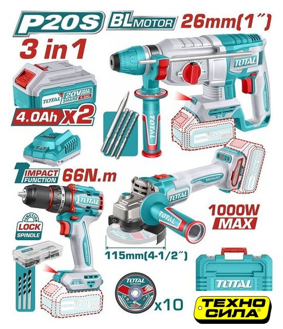 Комплектация | Дрель-шуруповерт ударная TOTAL TIDLI206681 - 1 шт.Углошлифмашина аккумуляторная TOTAL TAGLI27153 - 1 шт.Перфоратор аккумуляторный TOTAL TRHLI16168 - 1 шт.Акукумулятор 4,0 Ач TFBLI20021 - 1 шт.Зарядное устройство TFCLI2001 - 1 шт.Бур - 3 шт.Долото - 1 шт.Отрезные диски по металлу - 10 шт.Аксессуары к дрели-шуруповерту - 47 шт.ИнструкцияКоробка |