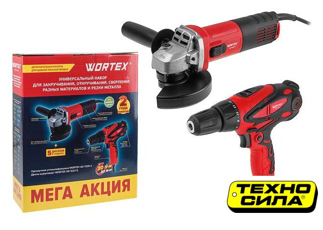 Комплектация | Дрель-шуруповерт WORTEX DR 1023 D - 1 шт.;Одноручная углошлифмашина WORTEX AG 1209-3 - 1 шт.;Отрезной круг WORTEX 125x1,2x22,2 мм - 5 шт. |