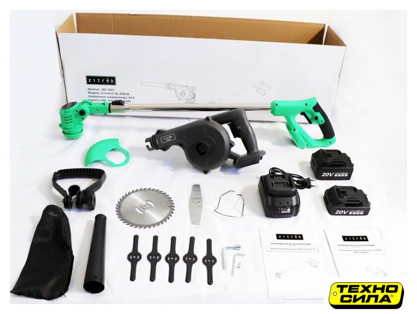 Комплектация | Триммер GreenCut 20:Триммер - 1 шт.Режущий диск - 1 шт.Пластиковые ножи - 5 шт.Металлический нож - 1 шт.Защитный кожух - 1 шт.Металлическая скоба - 1 шт.Дополнительная рукоятка - 1 шт.Шестигранный ключ - 1 шт.Ключ торцовочный - 1 шт.Винт - 1 штРуководство по эксплуатации - 1 шт.Воздуходувка ZKBL20:Воздуходувка - 1 шт.Насадка-труба - 1 шт.Мешок для сбора пыли - 1 шт.Руководство по эксплуатации - 1 шт.Аккумулятор 2,0 Ач - 1 шт.Аккумулятор 4,0 Ач - 1 шт.Зарядное устройство - 1 шт. |
