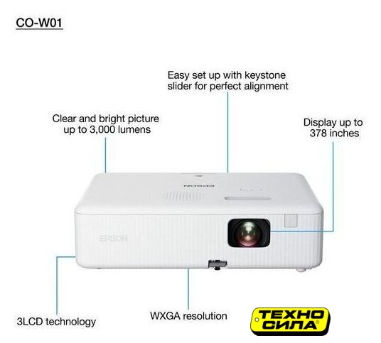 матрица 3LCD, XGA (1024x768), светодиодный (LED), яркость 3400 ANSI лм, контраст 15000:1, экран 30-300"