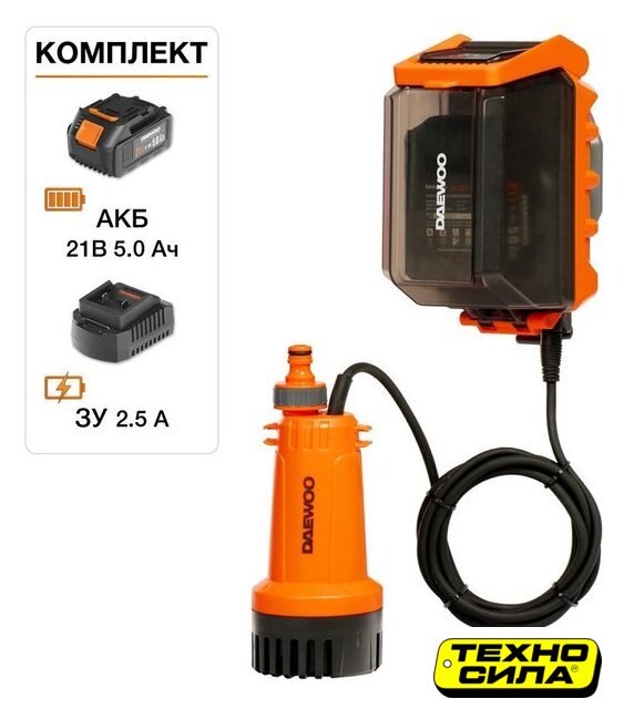 Комплектация | - Насос;- Аккумулятор DABT 5021Li;- Зарядное устройство DACH 2521Li;- Адаптер для быстросъемного коннектора;- Крепление на стену;- Крюк для фиксации со шлангом;- Инструкция по эксплуатации;- Гарантийный талон.Товар совместим со всеми аккумуляторными батареями и зарядными устройствами DAEWOO линейки 21В |