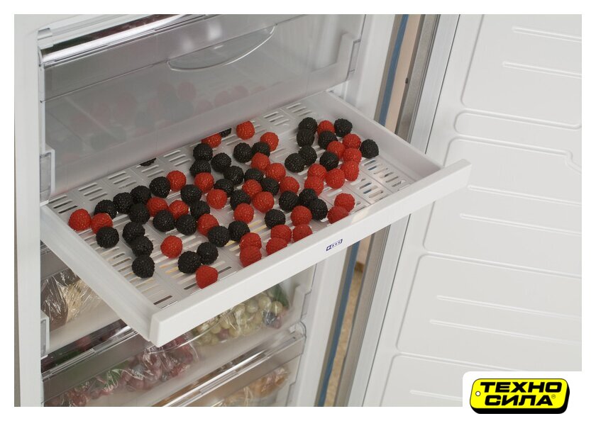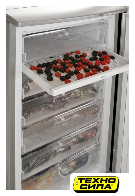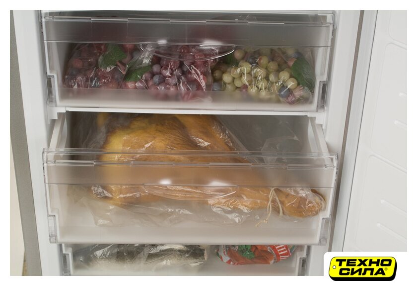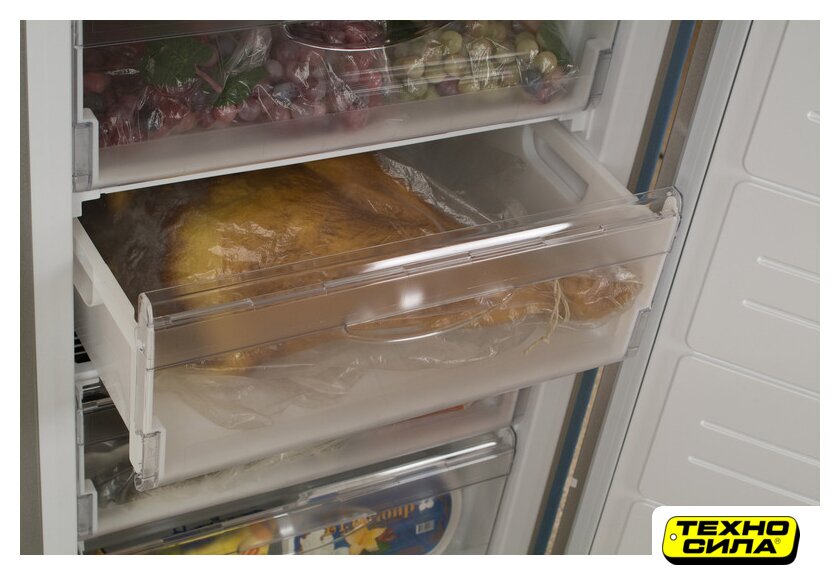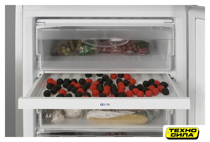 отдельностоящий, без No Frost, электронное управление, класс A+, полезный объём: 324 л (205 + 119 л), зона свежести, подставка-лоток для бутылок, лоток для яиц, 59.5x62.7x186.8 см, серебристый