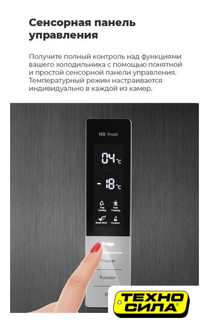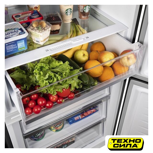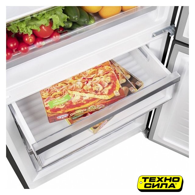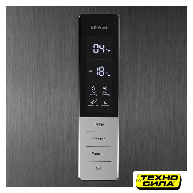 отдельностоящий, полный No Frost, электронное управление, класс A+, полезный объём: 417 л (288 + 129 л), инверторный компрессор, лоток для яиц, отделка: стекло, 83.6x63.6x183 см, серый
