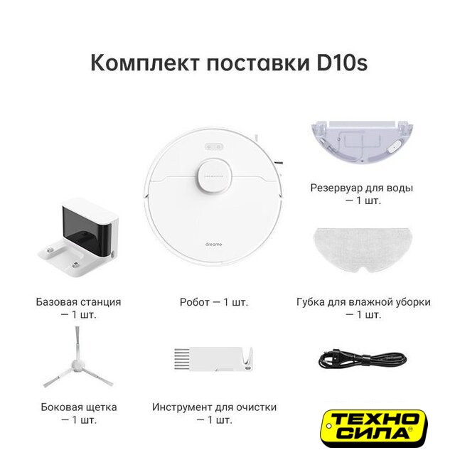 Комплектация | Робот-пылесосРезервуар для воды с тряпкойБазовая станцияЗапасная боковая щеткаИнструмент для очисткиКабель питания |
